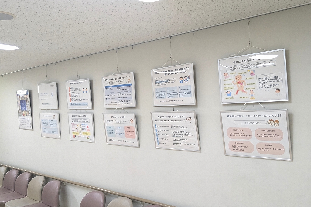 当院 糖尿病療養検討委員会による『2025年11月 糖尿病教室』のスライドパネルを泌尿器科外来前壁面ギャラリーに展示しています。