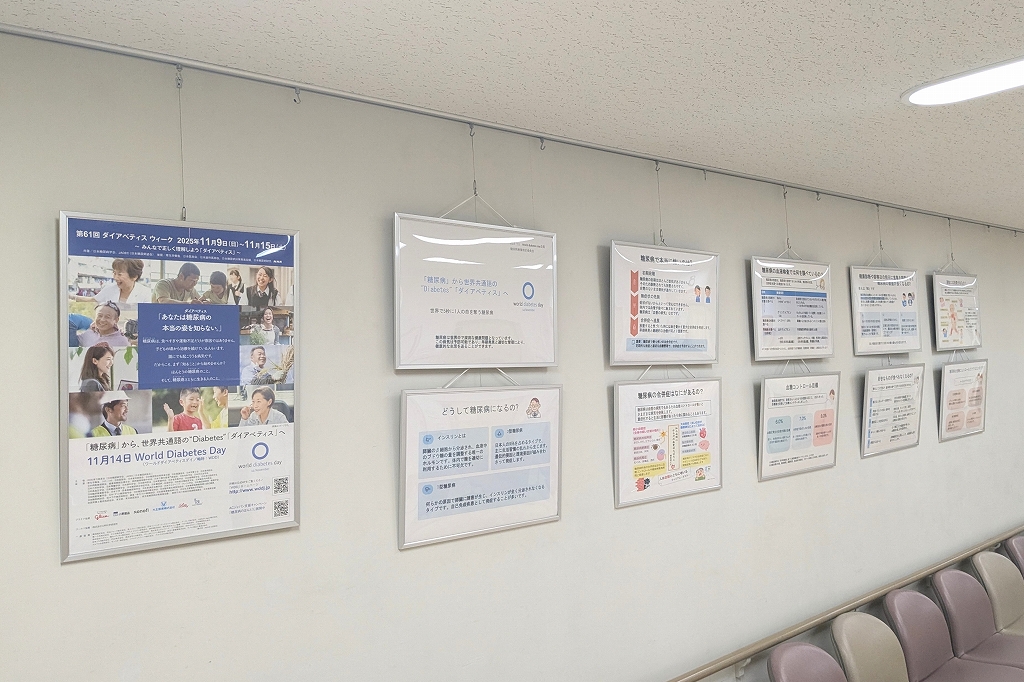 当院 糖尿病療養検討委員会による『2025年11月 糖尿病教室』のスライドパネルを泌尿器科外来前壁面ギャラリーに展示しています。