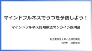 2025.12.16 【動画配信】マインドフルネス認知療法 オンライン説明会 当院精神科で行っている「マインドフルネス認知療法」のオンライン説明会の模様を、当院の公式YouTubeチャンネルにて公開しました。 こちら☟からもご視聴いただけます。 (画像をクリックしてください) ギャラリー一覧へ戻る