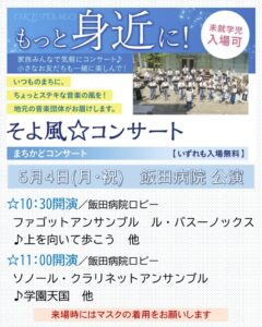 このゴールデンウィーク期間に開催される『オーケストラと友に音楽祭2026』のプログラムの一つ“そよ風☆コンサート”の2公演が以下の日程で飯田病院ロビー(1Fエントランスホール)で開催されます。