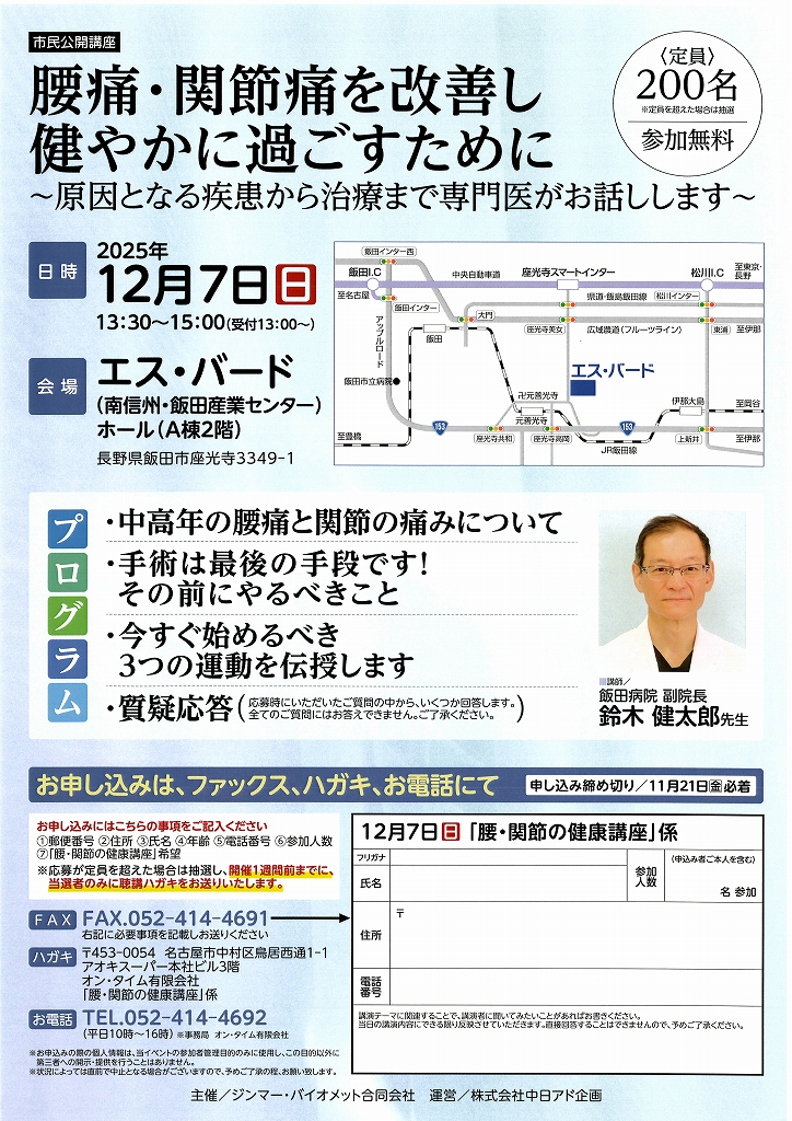 市民公開講座「腰痛・関節痛を改善し健やかに過ごすために」のお知らせ