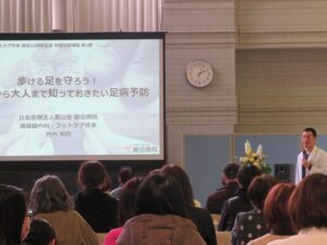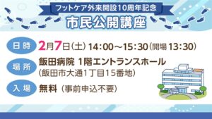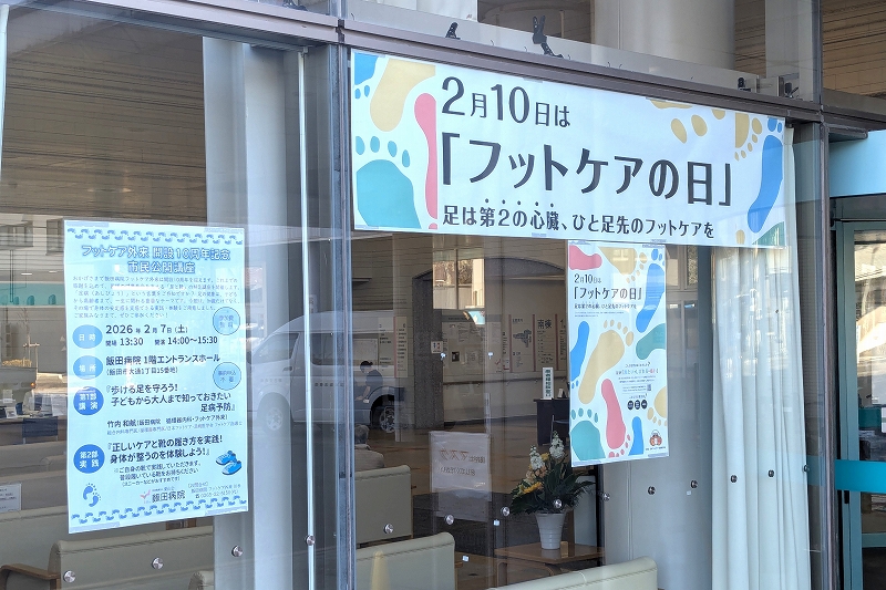 2026.02.10 2月10日はフットケアの日 2月10日のフットケアの日にあわせ、当院では以下の啓発活動を行っています。 フットケア外来 開設10周年記念 市民公開講座 フットケア外来が開設10周年を迎えることを記念して、市民公開講座を開催しました。 当日の模様を動画配信しています。 👈からご覧いただけます。 啓発ポスターの展示 日 時;2月5日(木)~2月28日(土) 場 所;飯田病院 泌尿器科外来前壁面ギャラリー テーマ;靴を正しく履くことの本当の意味 詳細はこちら👈 お知らせ一覧へ戻る